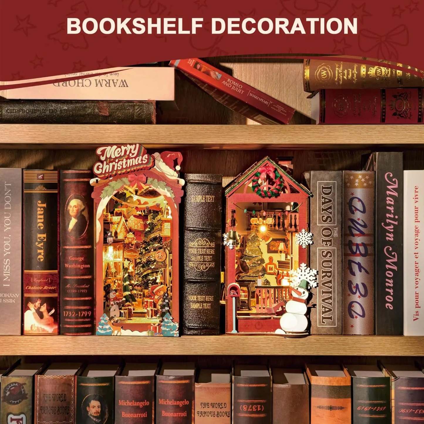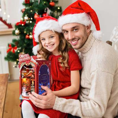 The Christmas Village Street DIY miniature kit recreates a cozy European Christmas Eve in a glowing book nook. Snow-dusted rooftops, warm shop windows, decorated trees and cheerful snowmen turn your shelf into a festive winter street full of light and warmth.