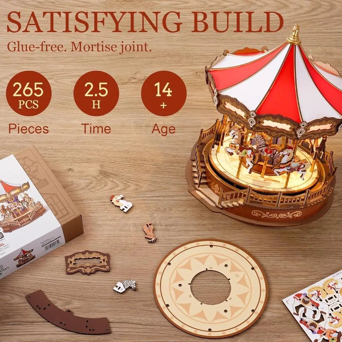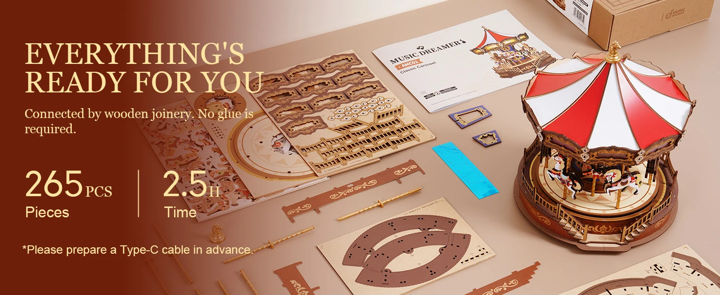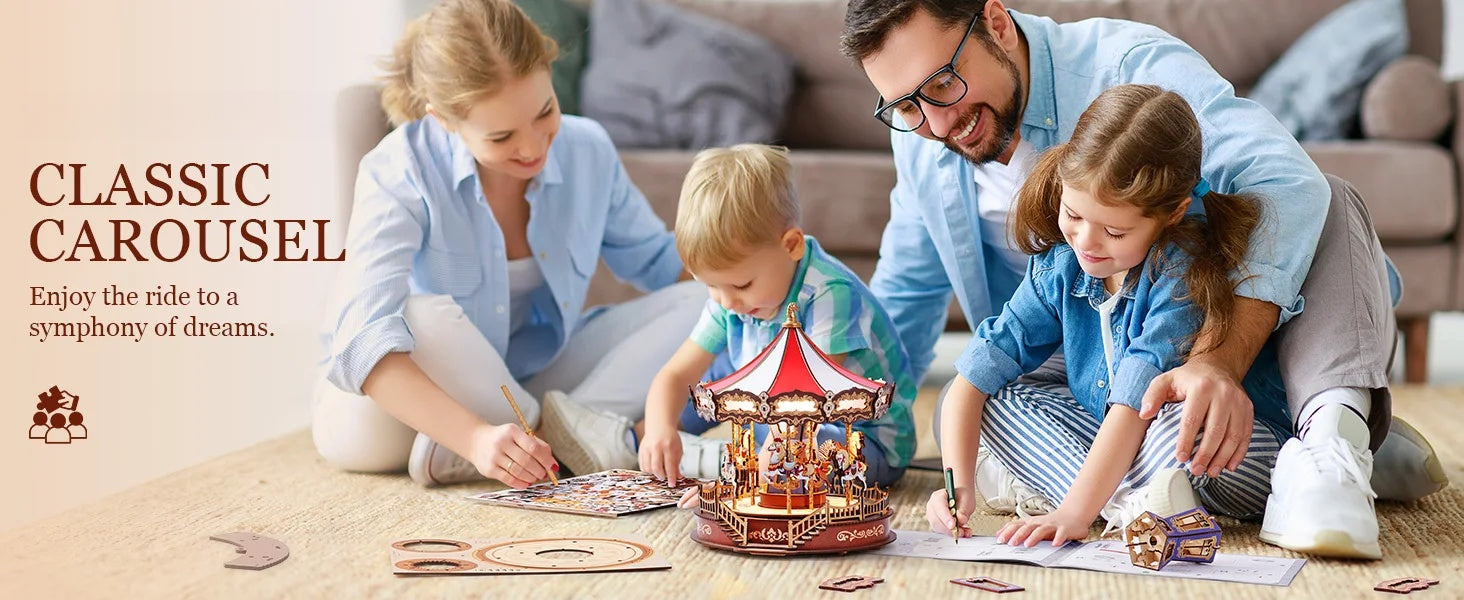 This 265-piece wooden puzzle offers an engaging and rewarding hands-on project, requiring approximately 2.5 hours to assemble—all without glue. Once completed, the carousel stands at 25.4 × 25.7 × 29.5 cm, making it a stunning decorative piece for craft lovers and hobbyists alike.