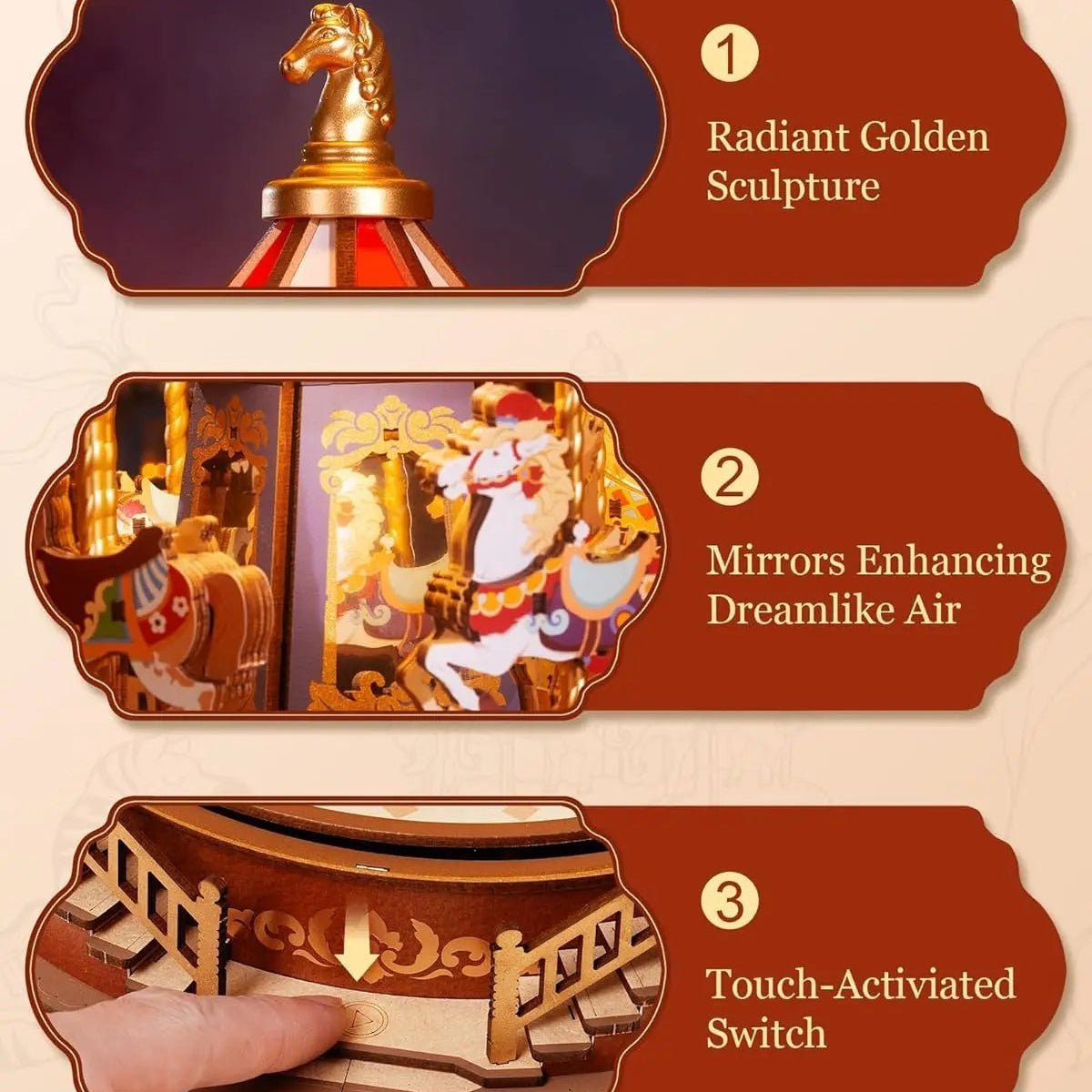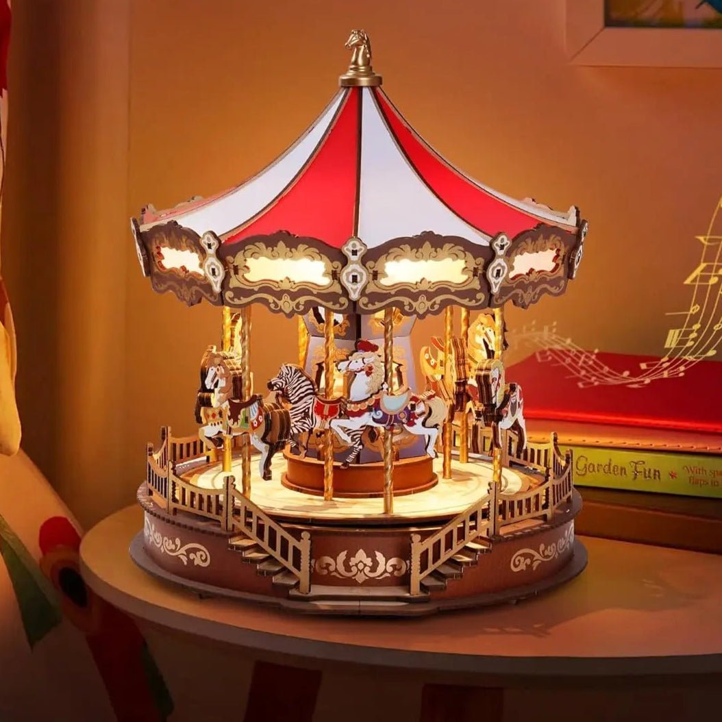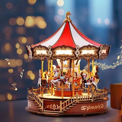 Immerse yourself in the magic of a classic carousel with this exquisitely crafted DIY wooden music box. Thoughtfully designed with a delicate rotating mechanism, the elegantly painted horses gracefully move up and down, while soft lighting and timeless melodies evoke a sense of nostalgia and wonder.